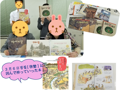 マイブームは、김황作家の絵本。最近何冊か購入したので、多くのみなさんに読んでもらいたくて今日も持っていきました。
